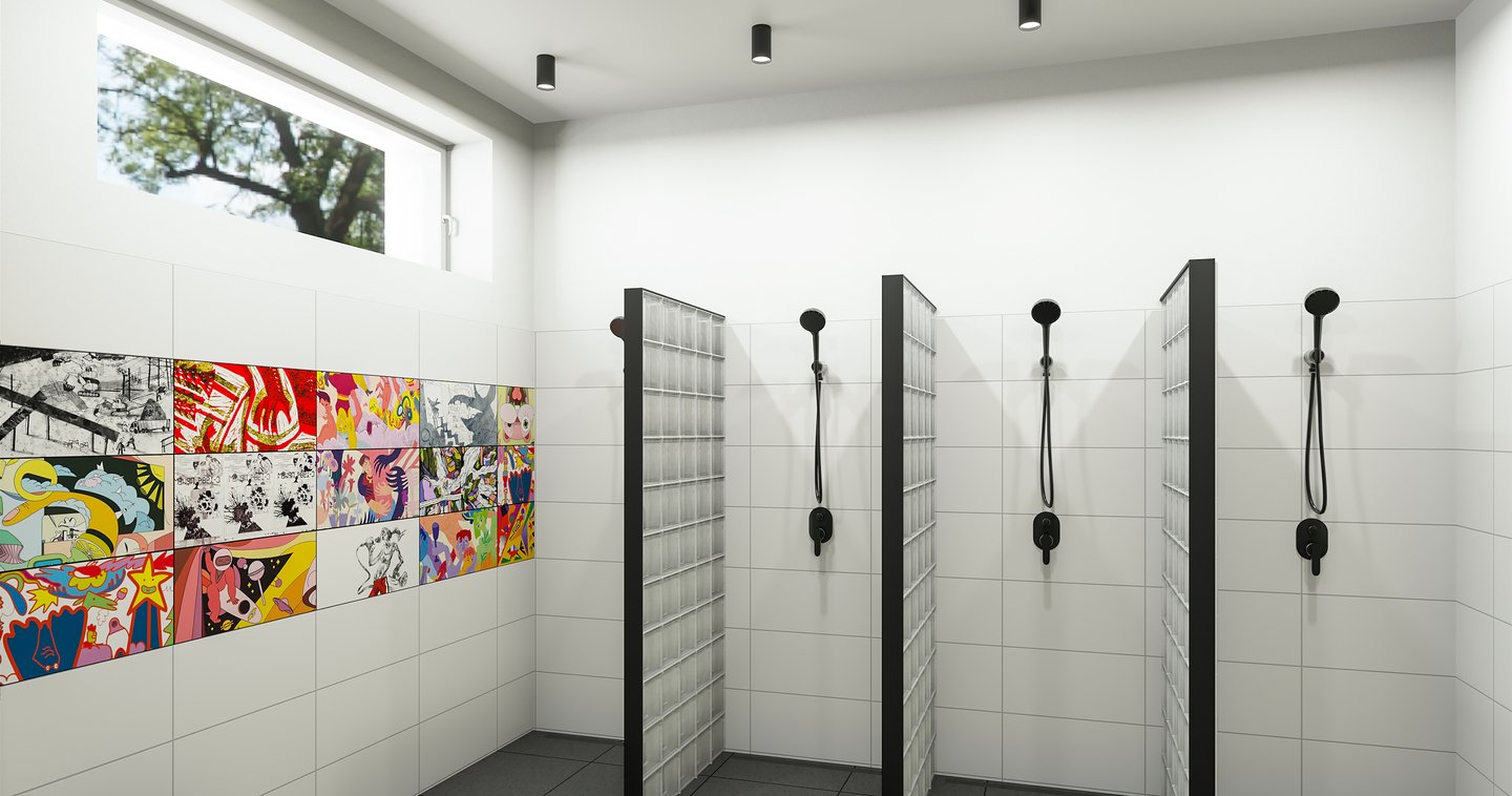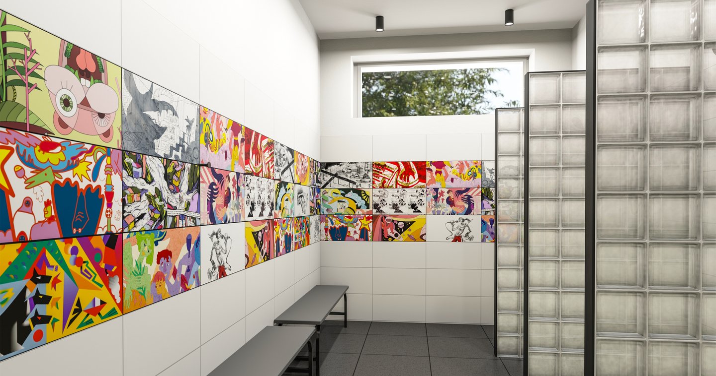 Оформление душевых зон в студенческом лагере «Руза» НИУ ВШЭ с использованием иллюстрированной плитки.